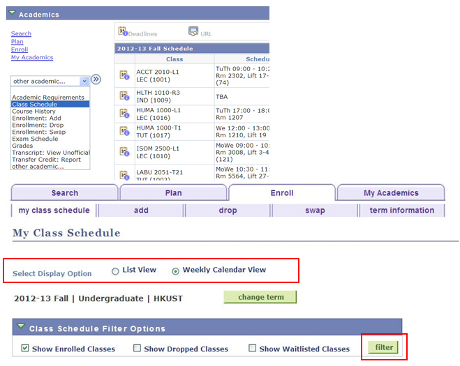 You can click on “Class Schedule” and then “>>” button, then you will see the “Select Display Option” buttons for List or Weekly Calendar View. You also need to “tick” the checkbox for the “Class Schedule Filter Options”. By clicking “filter”, your class schedule will pop up.