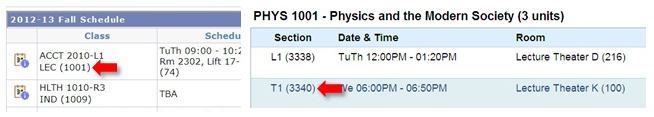 Class number is a unique number (usually with 4 digits) for each class in an academic term. It is used by the system to identify the class. Different sessions of the same course carry different class numbers. In the following examples, class numbers of ACCT2010-L1 and PHYS1001-T1 are 1001 and 3340 respectively.